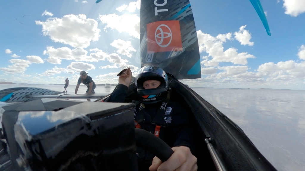 “There is still a bit of water on the surface of the lake now, but we are finding some dry patches. The salt is literally drying before our eyes, the water is evaporating, and we found some nice little runways to get out there to do a few runs which has been fantastic.