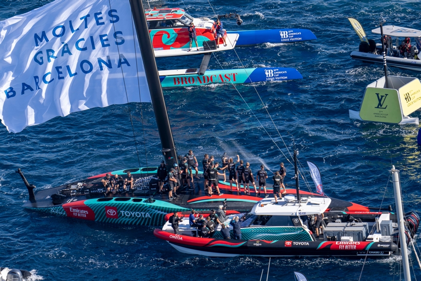 Emirates Team New Zealand celebrating their fifth America's Cup win in 2024.