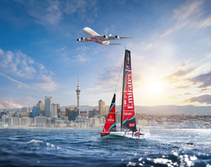 Emirates' A380 flying over Auckland – supporting Emirates Team New Zealand for over 20 years.